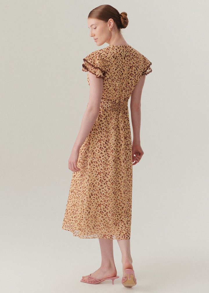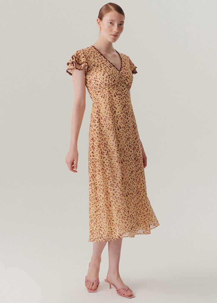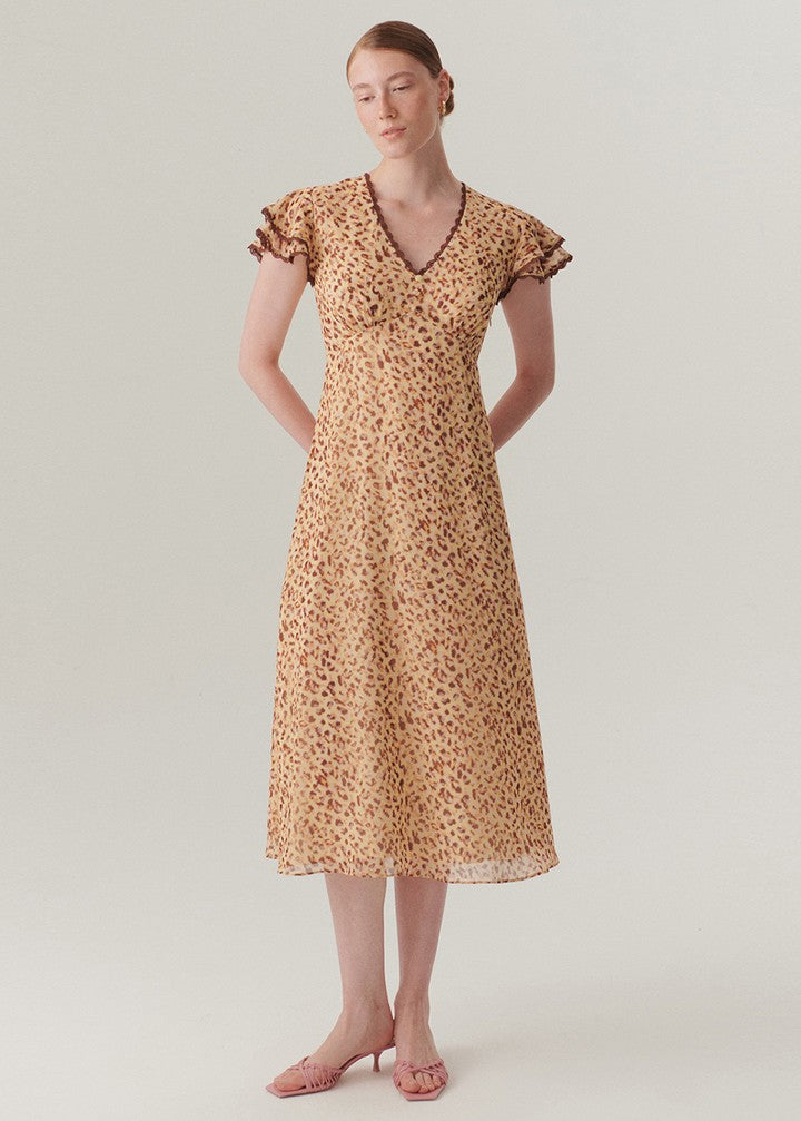 Brown Chiffon Midi Dress with Basket Pattern, Belted Waist, and Fitted Cut