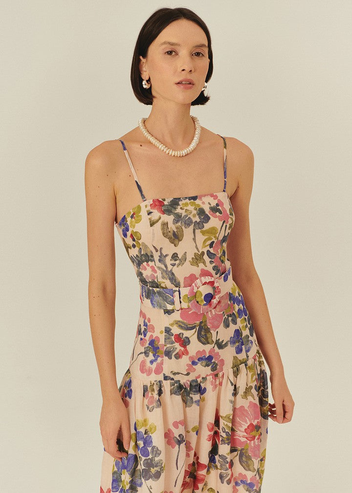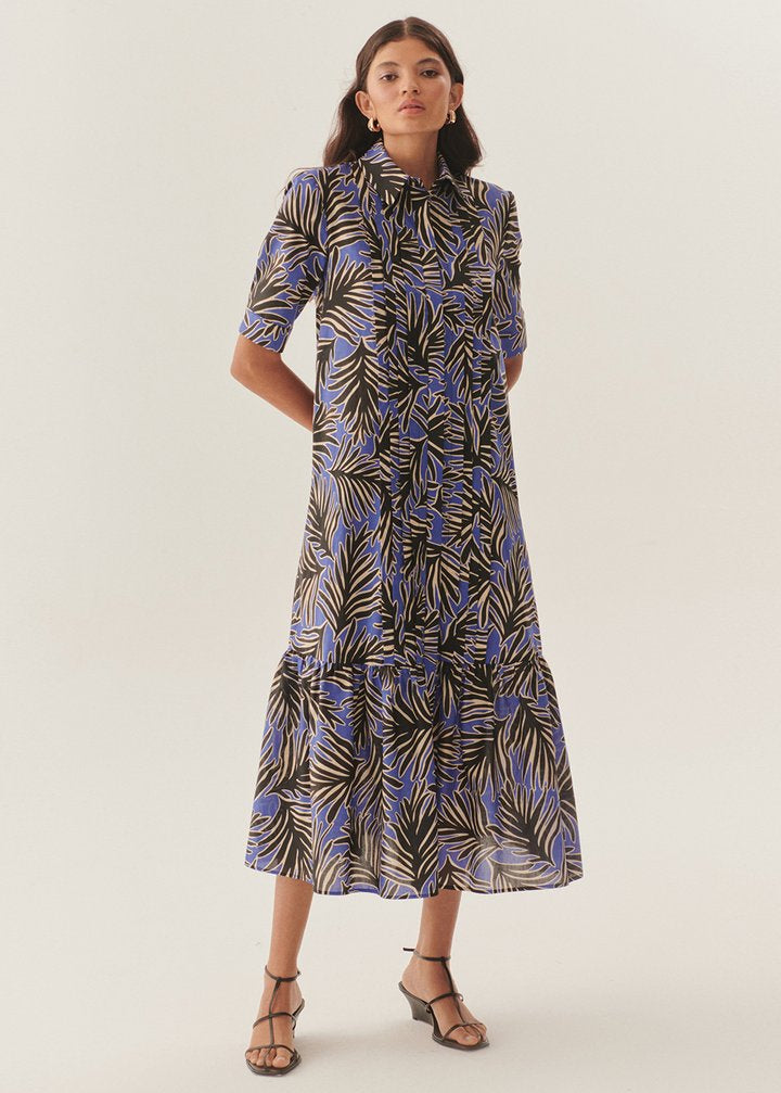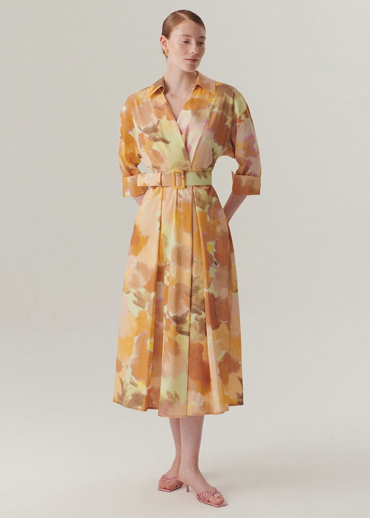 Floral Print Midi Dress with Shirt Collar, Long Sleeves, and Waist Tie Detail