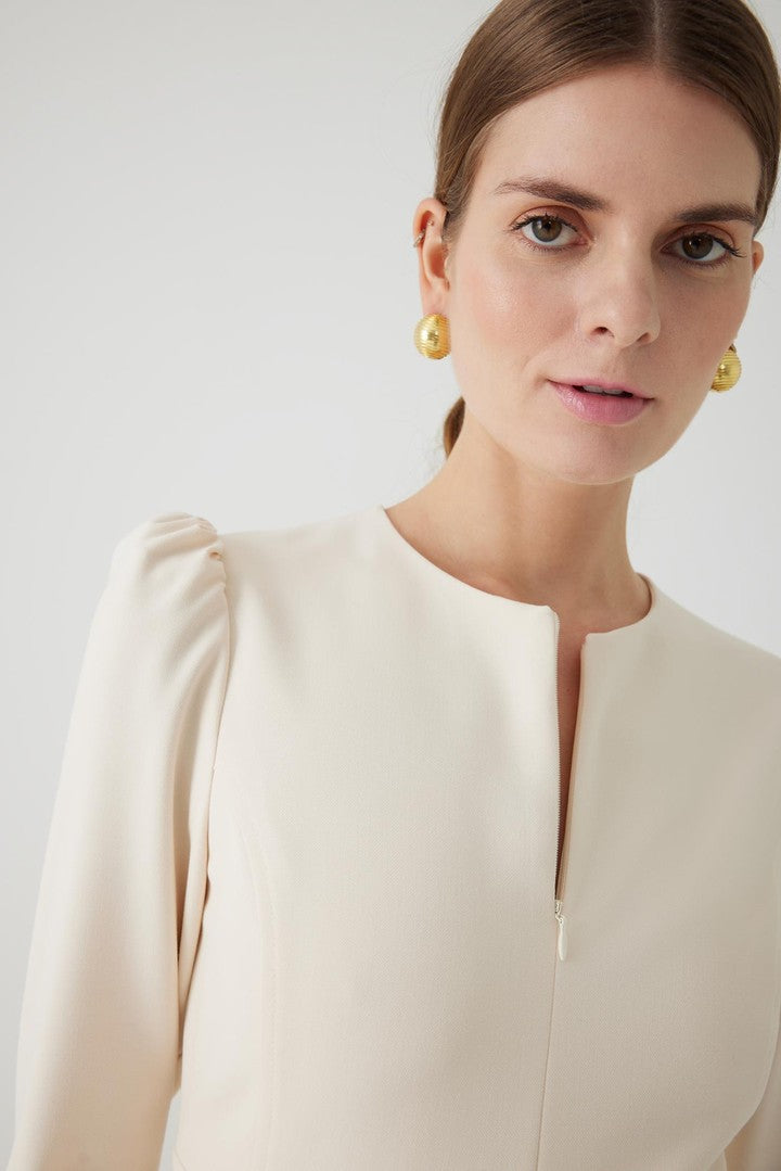 Beige Short Sleeve Dress with Front Buttons and Fitted Waist