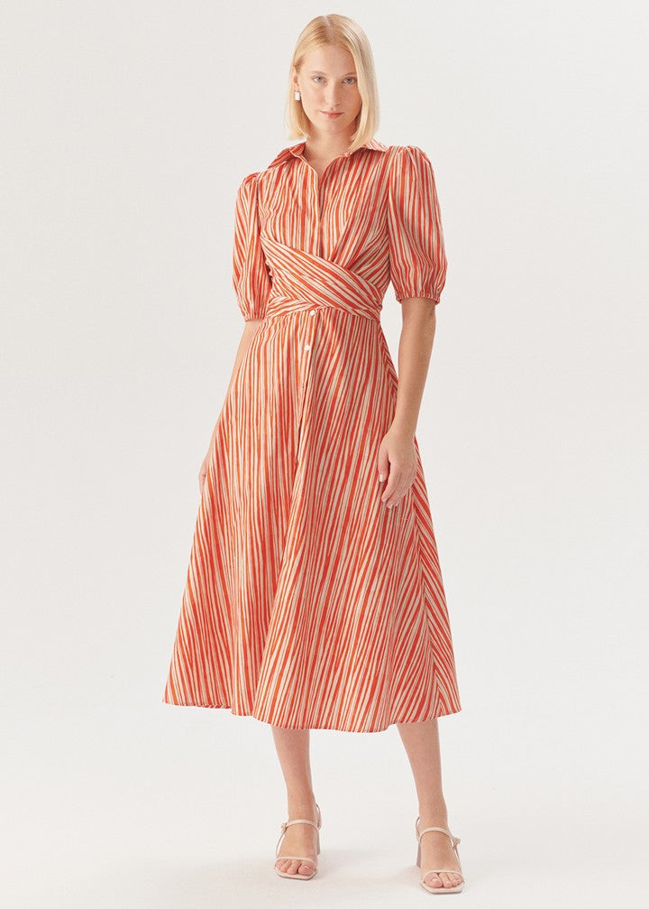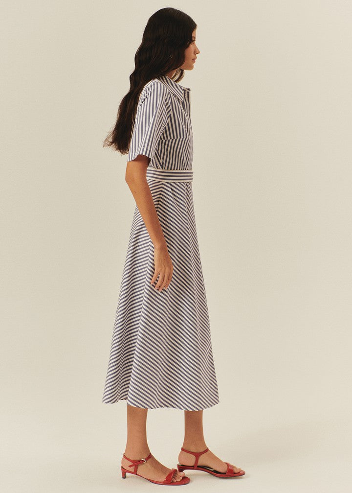 Striped Midi Dress with Shirt Collar, Belt, and Fitted Waist