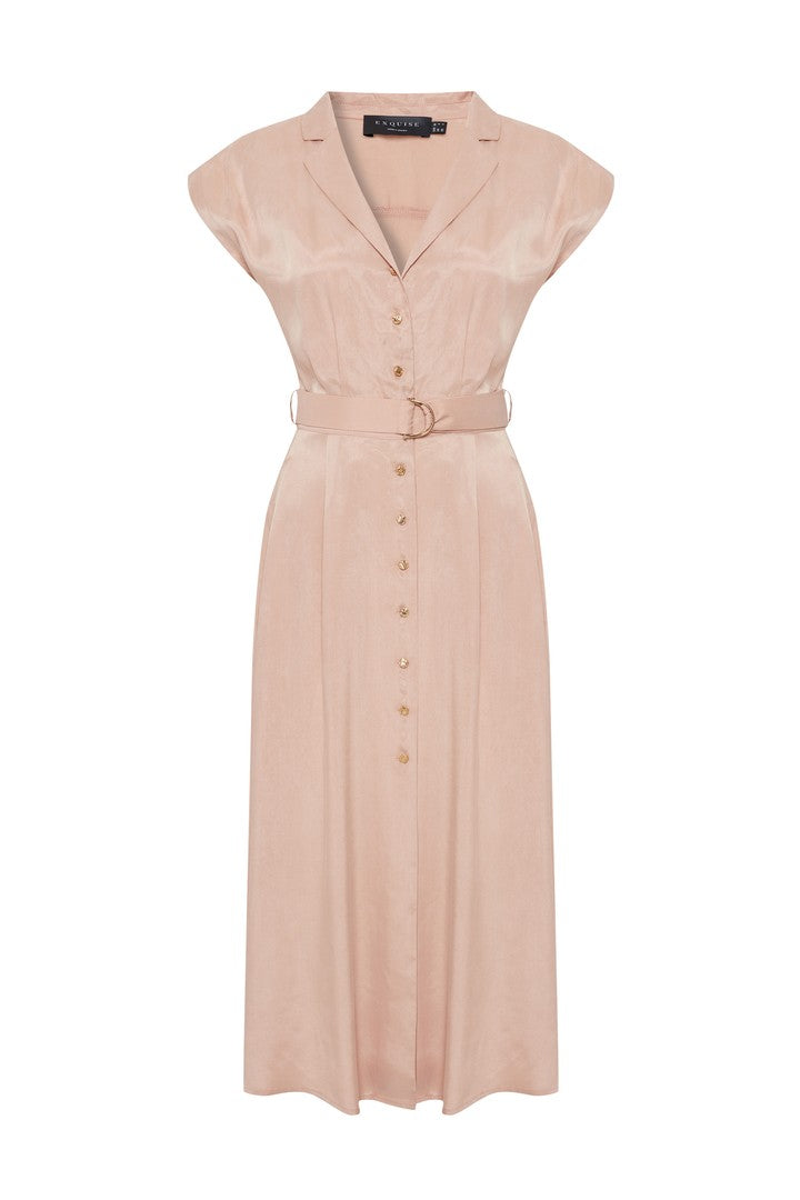 Khaki Midi Shirt Dress with Fitted Waist, Sleeve Details, and Waist Belt