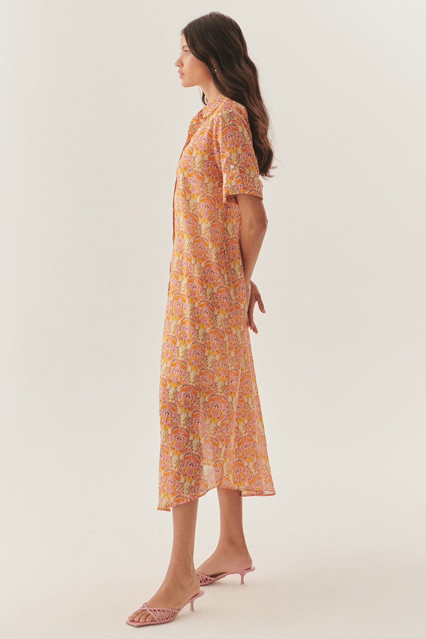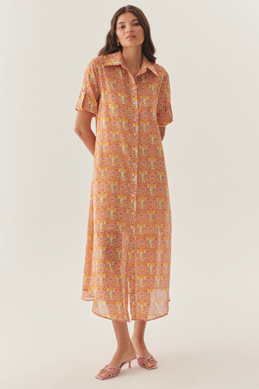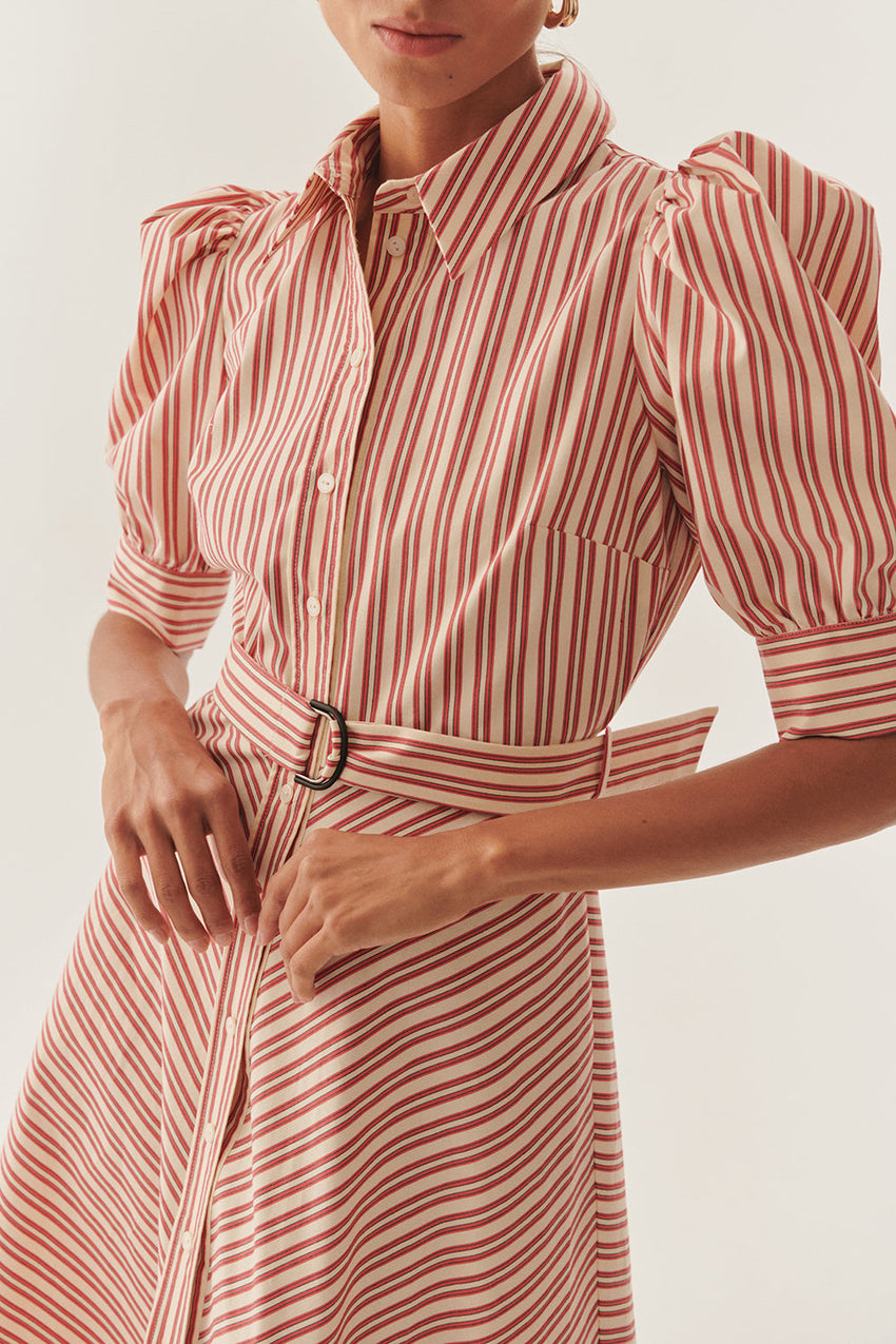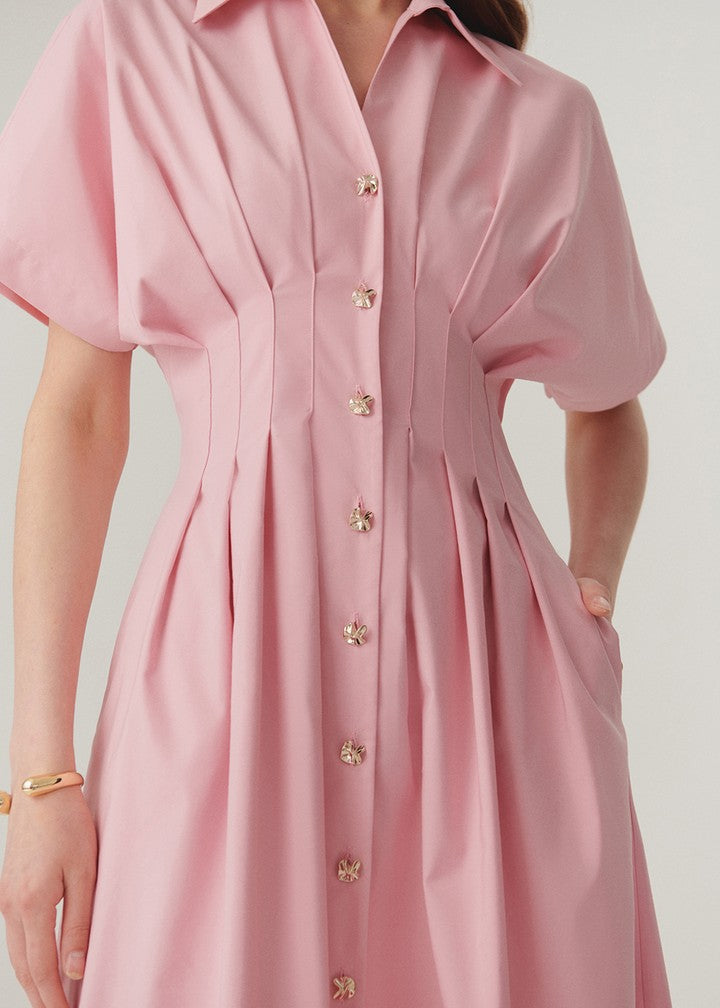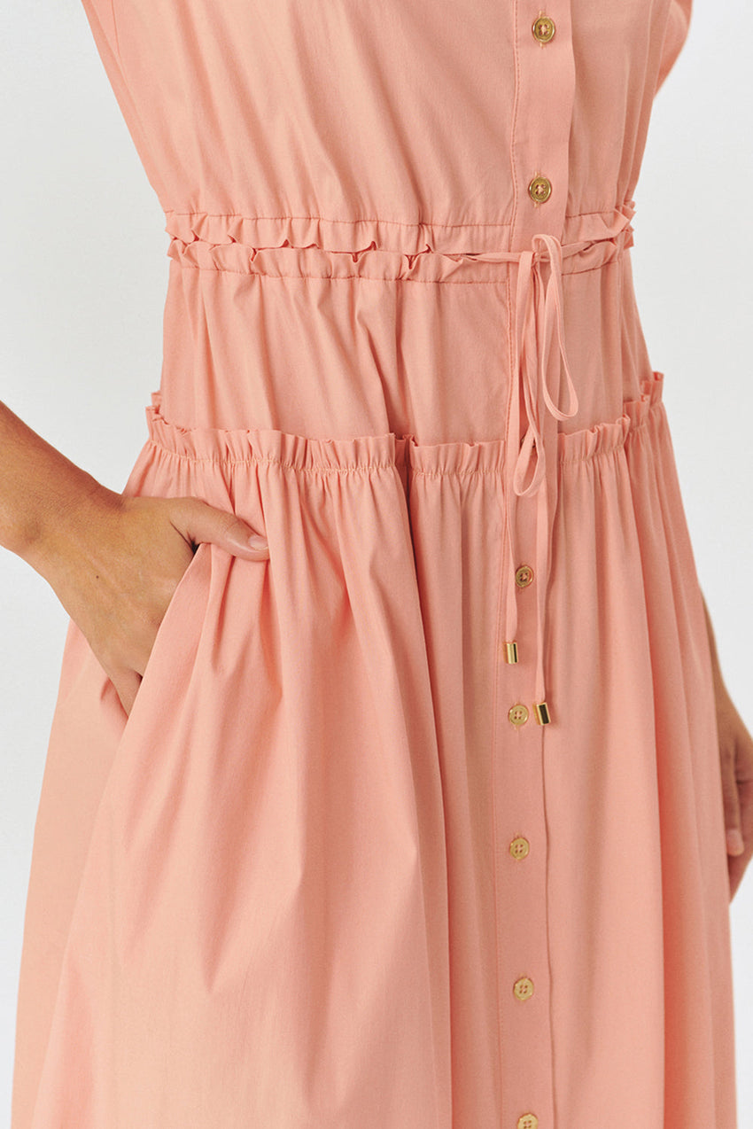 Salmon Balloon Sleeve Fitted Waist Midi Shirt Dress